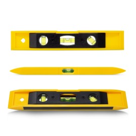 Level is made of plastic with magnetic back. Three easy-to-read vials: Level, Plumb, and 45 degree. Convenient top view center vial. It is great for onsite, quick leveling needs.